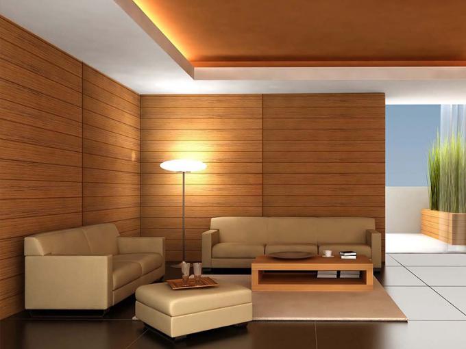 तस्वीर में रहने का कमरा लकड़ी के डिजाइन टुकड़े टुकड़े वाले पीवीसी पैनलों के साथ सजावटी है, यह असली लकड़ी की तरह दिखता है, लेकिन लकड़ी की तुलना में लागत बहुत सस्ता और आसान है। इसे साफ करना भी आसान है।